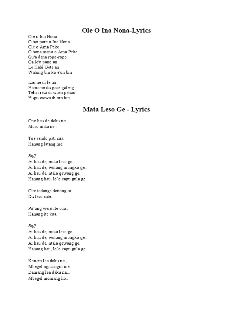 Mata Leso Ge adalah lagu daerah Manggarai Flores ciptaan Ivan Nestorman. The one and only for you Reff. Ai hau de mata leso ge.